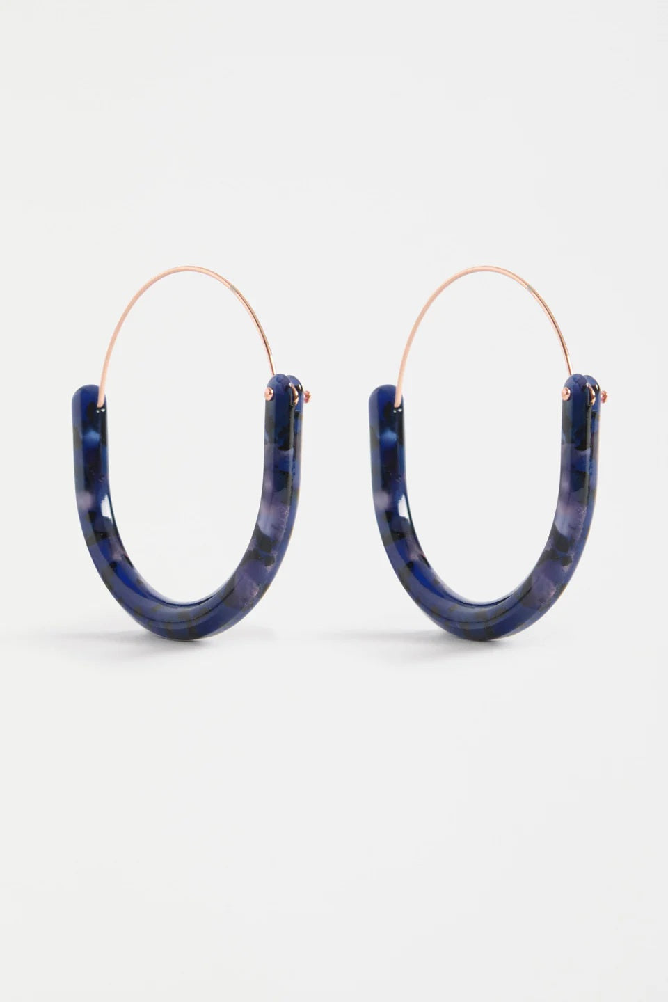 The Aki Hoop Earring is an ELK best selling style, now in two new seasonal colours. These lightweight, large hoops are comprised of two acetate sheets holding a wire hoop between them, looping into a contemporary oval hoop. The swirling patterns create a tortoise shell-like design, which adds depth and interest