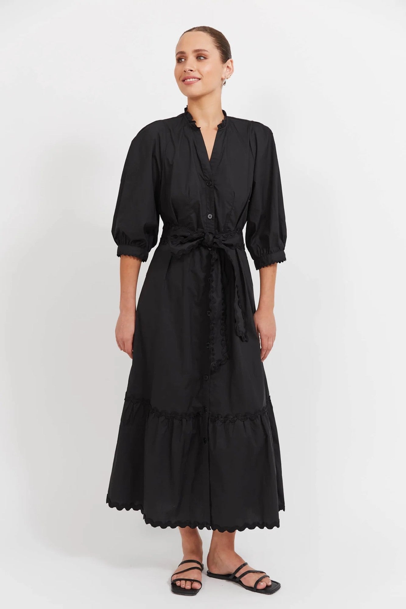 This elegant cotton maxi dress features a soft ruffled V-neckline, 3/4 sleeves with delicate ric-rac trim, and a flowing tiered skirt for an elevated warm-weather look. The button-through front offers flexible styling, while a self-fabric belt - finished with matching ric-rac edging - defines the waist for a flattering silhouette. Complete with internal side pockets and a full maxi length, it's a versatile piece that can be dressed up or down.