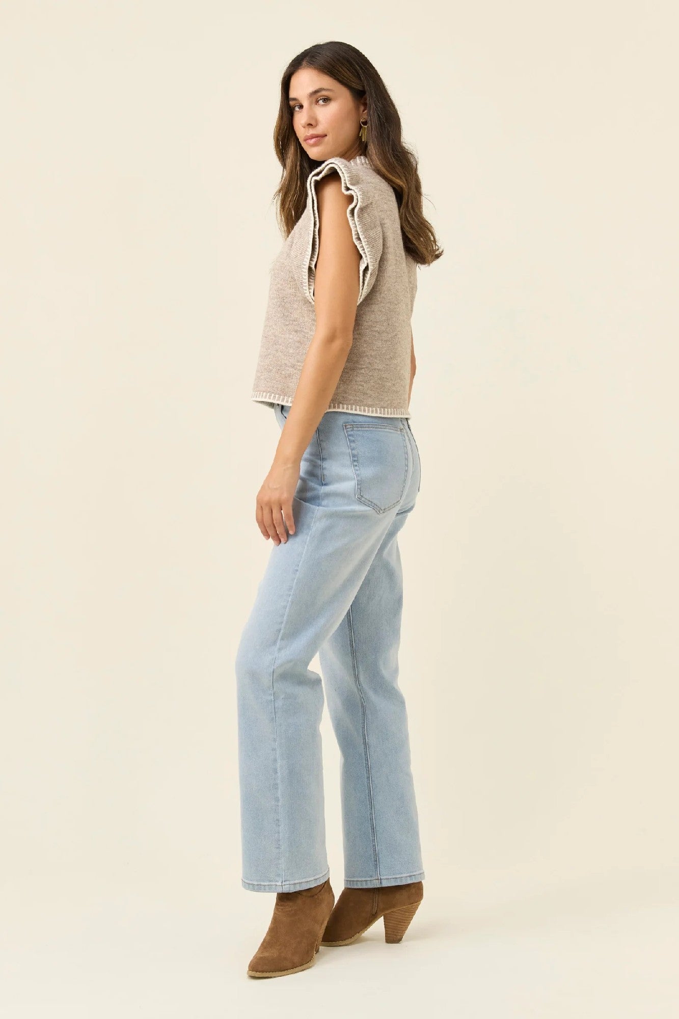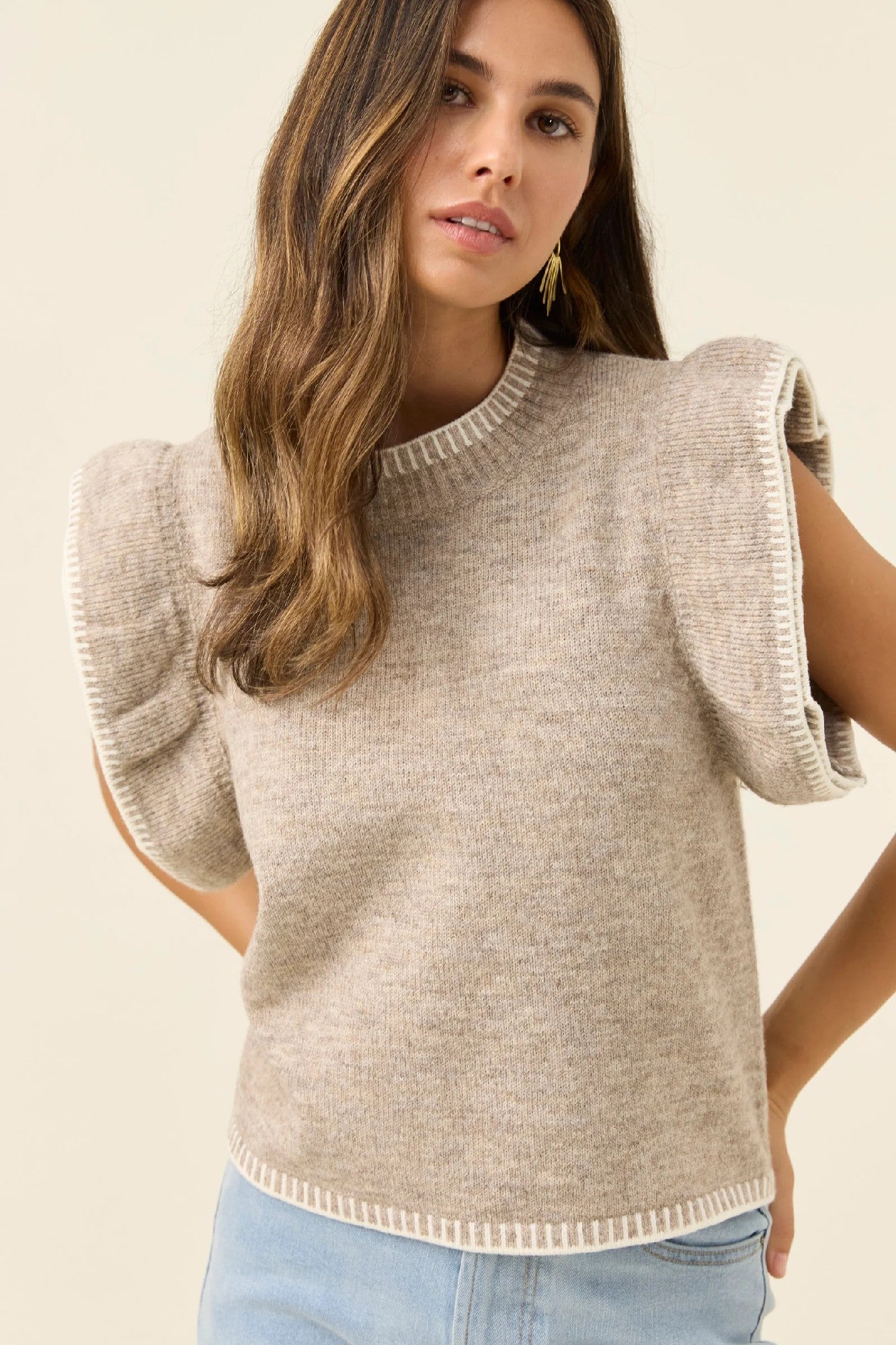 A much-loved silhouette reimagined for the season. The Athena Frill Knit Top features a soft marle knit in a wool-blend, with layered flutter sleeves and contrast blanket stitch detailing, designed to bring texture and warmth to everyday looks.