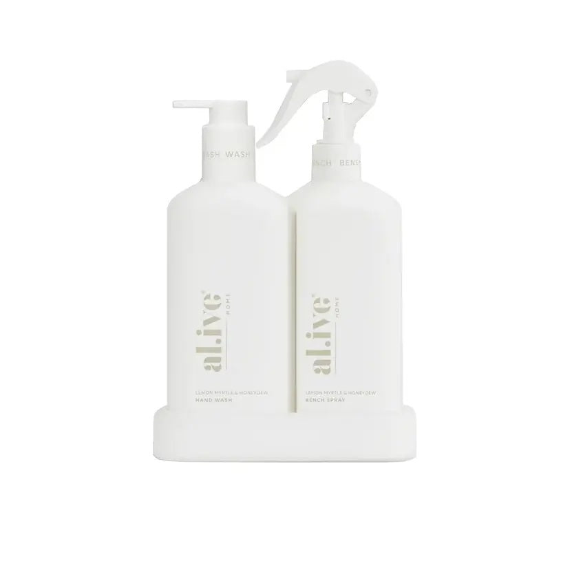 A Kitchen Duo including a 300ml Bench Spray and 300ml Hand Wash in our Crisp White colourway. The interlocking bottles sit neatly in a matching tray and feature the bright, uplifting scent of Lemon Myrtle & Honeydew.