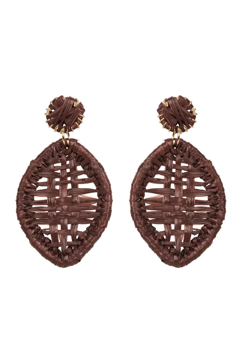 Teardrop shape wrapped in raffia with a chocolate weave finish. Lightweight with stud closure.