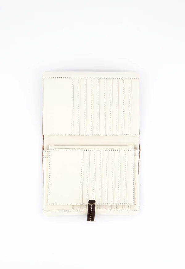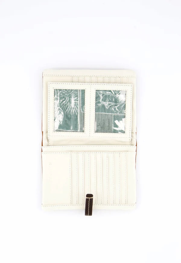 Twenty-nine card slots. Two ID windows. Three note folds. Rear zipped coin pocket. Leather tab with press stud closure. Organic printed cotton lining.
